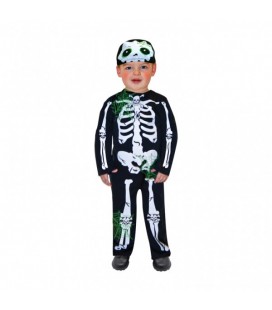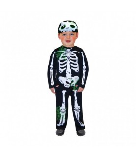 Diese Skelett-Verkleidung für Kleinkinder verfügt über eine Mütze mit dem Bild eines Schädels, einen schwarzen Overall mit Skelettknochen.