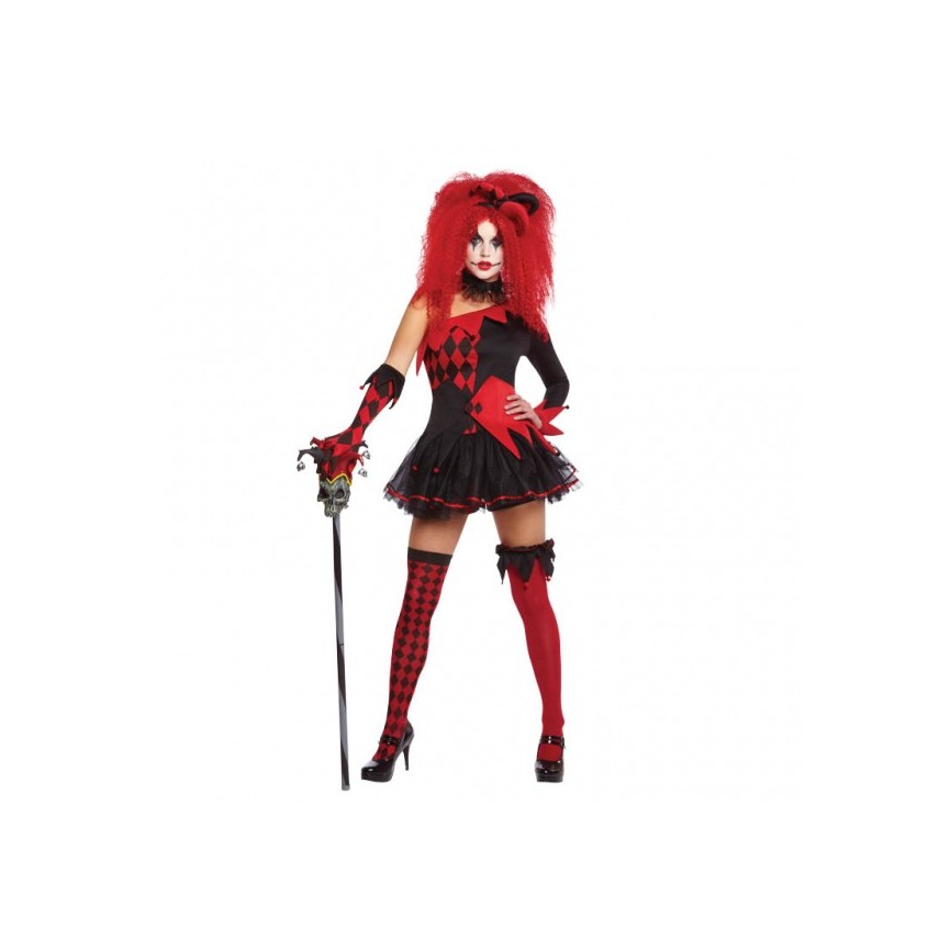 Das Jesterina Clown Kostüm verfügt über ein schwarz-rotes Tüll-Kleid, ein Tüll-Halsband, einen Handschuh und ein sexy Strumpfband. Ein Haar-Reif und Strümpfe vervollständigen dieses Kostüm.