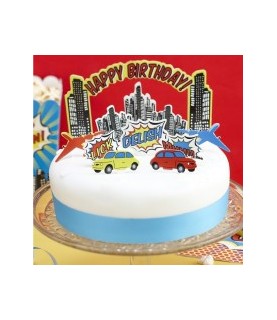 Dieses Kit enthält 11 Kuchendekorationen in Form von Autos, Flugzeugen und Gebäuden mit einem Happy Birthday-Banner. Ohne Zuckerguss, Sie brauchen die Dekoration nur auf den Kuchen zu stellen. Großartig für eine Superhelden-Geburtstagsfeier!