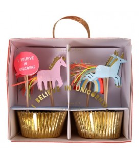 Ein Kit zum Herstellen von schönen kleinen Kuchen mit Pikser deren Motive an Einhörner und ihr Universum erinnern. Ein Märchenthema, das Ihr Geburtstagsparty zauberhaft macht! Dieses Kit enthält 24 Kuchenförmchen und 24 Pikser mit Fähnchen. Mit diesem Kit verleihen Sie Ihrem Fest eine girly und trendy Note!