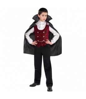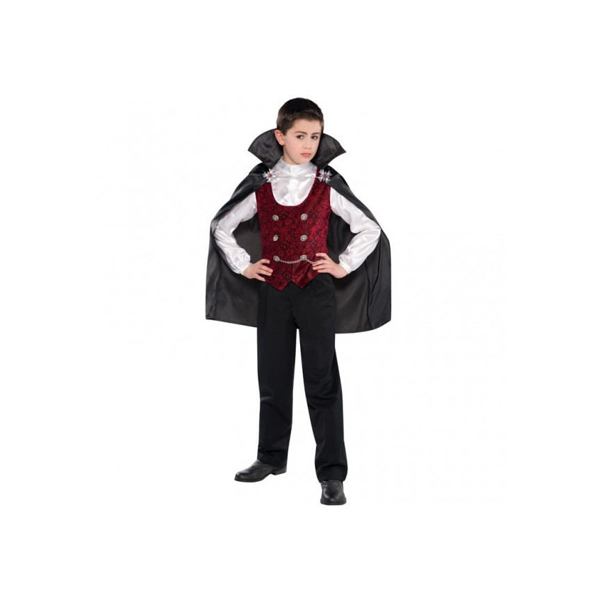 Unsere Dark Vampire Verkleidung verfügt über ein seidiges, weißes Hemd mit langen Ärmeln; daran ist befestigt eine rote Weste mit Brokatmuster, silberfarbene Knöpfe und Kettchen. Der schwarze Umhang mit hohem Kragen hat vorne Medaillons und ein Kettchen.