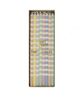 24 Kerzen mit Pailletten für eine fröhliche und bunte Dekoration der Geburtstagskuchen. Größe der Kerzen : 15 cm. Meri Meri.