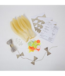 Im Kit enthalten sind 8 transparente Luftballons, ein Zwirnfaden, 8 Blätter mit Aufkleber in Form von Schleifen und ein Beutel Konfetti.