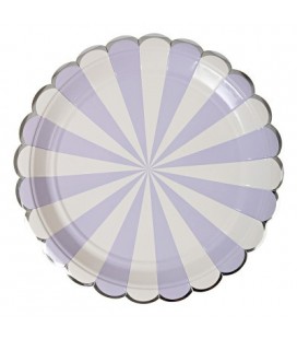 Jede Packung enthält 8 Pappteller mit lavendelblauen Streifen und einem hübschen silberfarbenen Folienrand. Diese Teller von schönem Kontrast zwischen dem geometrischen Streifenmuster und dem gezackten Silberrand verzieren Ihren Tisch mit Sicherheit!