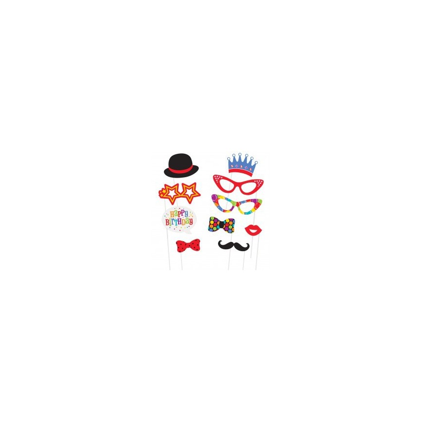 Photobooth-Satz mit 10 verschiedenen Elementen auf Stäbchen.