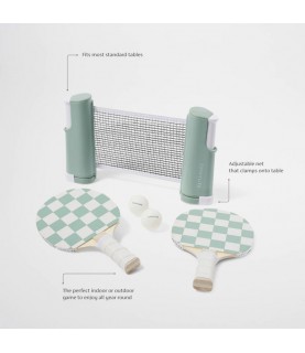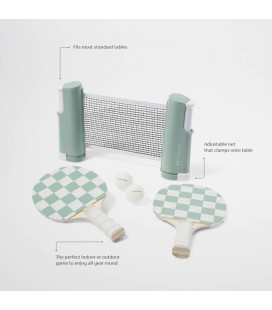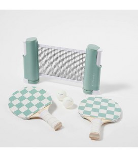 Let the game and the fun begin with our stylish table tennis game set. Want to play a game of table tennis but don't have a ping-pong table at your disposition? No problem! With this beautiful Sunnylife set you can play ping-pong on your own table at home, both indoors and outdoors.The retractable net is easily clasped to most table surfaces. With timber paddles and retro inspired checkerboard print this set is guaranteed to improve your match and provide hours of entertainment. Bring your game to the table and get ready to serve!
